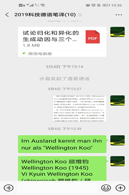 本学期我承担《科技德语口译》课程。从本课程的特点出发,需要学生的口译实践。因此,本人在每次备课时均准备了前期学生要研读的资料发布于雨课堂,但为了课程的效果,需要学生的现场口译实践和问答环节,还将微信群作为上课的直播平台。雨课堂和微信直播两者结合,达到了预期的效果。本次课共分三部分内容:教师讲解+学生口译实践+学生报告。师生都这样的在线授课方式均表示很满意。