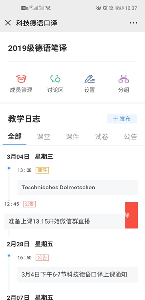 一场新冠肺炎疫情阻挡了学生们返校的步伐,但却未能阻挡我们新学期的教学活动。德语笔译课程组的老师们为了更好的呈现课堂效果,进行了多个线上授课平台的测试。在开学第一周,圆满成功地完成了线上授课的任务。下面我们请各位老师来讲述一下他们授课的感受。