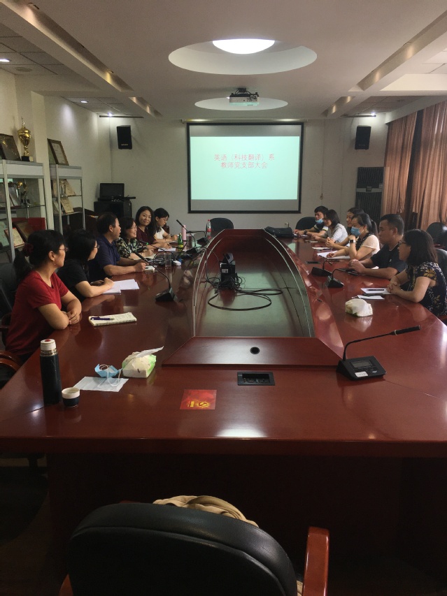 英语系(科技翻译)党支部于9月4日上午11点在beat365vip官网登录入口306会议室召开教师党支部大会,大会由支部书记姜诚老师主持。支部教师党员们就上个学期开始开展的“四史”学习交流心得体会,并鼓励教师党员继续认真完成学习强国平台的学习任务,坚持阅读“四史”学习材料,将“四史”学习与校史、学科发展史结合,传承红色基因,更好地坚守初心使命、坚定理想信念,投身新学期的工作。