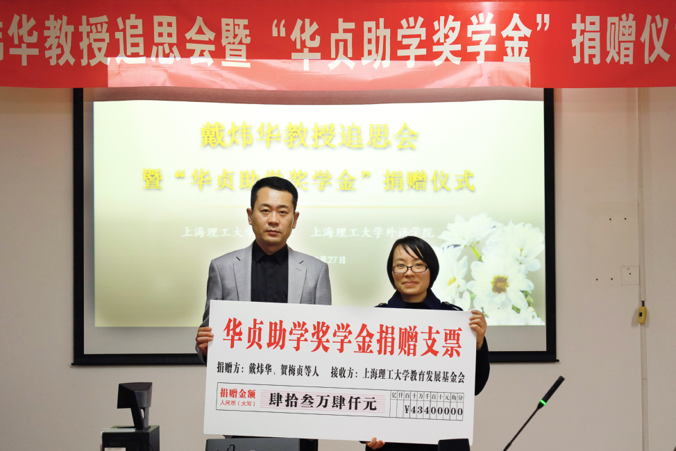 beat365vip官网登录入口党委书记曲德强代表beat365vip官网登录入口感谢戴炜华教授夫妇及其学生对“华贞助学奖学金”的捐赠,并将华贞奖助学金款项共计四十三万肆仟元,递交给beat365vip官网登录入口教育发展基金会。校友工作联络处副处长王杨代表学校基金会接受捐赠,感谢戴炜华教授夫妇及其学生关心学校发展、学生成长。