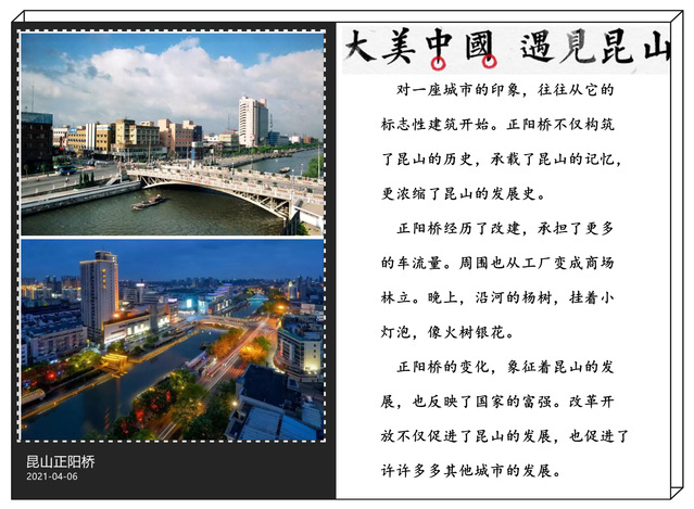 获得一等奖的作品来自于陈爱倩同学。这幅摄影作品的主题是《大美中国,遇见昆山》,作品以正阳桥的变化为主线,反映出国家的发展,城市的进步。对一座城市的印象,往往从它的标志性建筑开始。正阳桥不仅构筑了昆山的历史,承载了昆山的记忆,更浓缩了昆山的发展史。