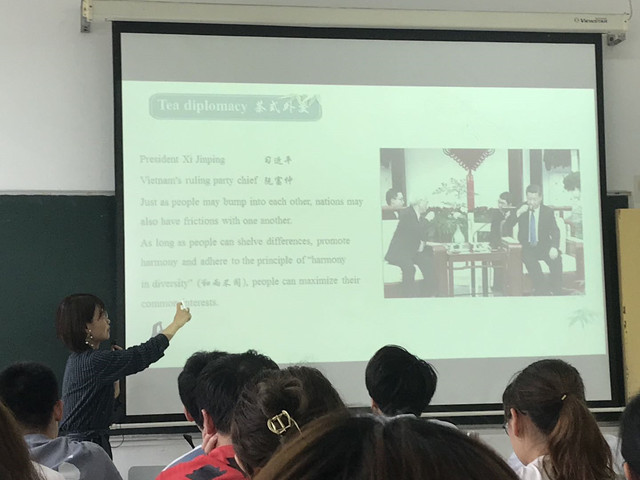 王老师在充分考虑授课对象语言专业属性的同时,条分缕析地推进知识点讲解,同时将思政教学要素有机融入其中,让学生在高效汲取中华文化滋养之余实现道德情操的陶冶、思想觉悟的升华。例如,在与学生讨论“茶”字的结构时,王老师引入习总书记2017年初会见越共中央总书记阮富仲时的一段精辟议论:“处在草木间的人,难免会有磕碰,于国与国之间,更难免有一定摩擦。但只要存异尚和,秉承‘和而不同’的理念,就可以找到最大公约数。因此茶之道也象征着中国人崇尚的与世界相处之道,‘以茶为媒、以茶会友’,恰是交流合作、互利共赢诚意的一种表达。”在王老师用中英双语呈现和解读习总书记讲话后,同学们深刻领悟了中华民族在处世与外交中必须奉守的“求同存异、大气谦和”的基本原则,进一步认清了身为外语专业人才所担负的“传播中华文化、讲好中国故事”的重大使命。