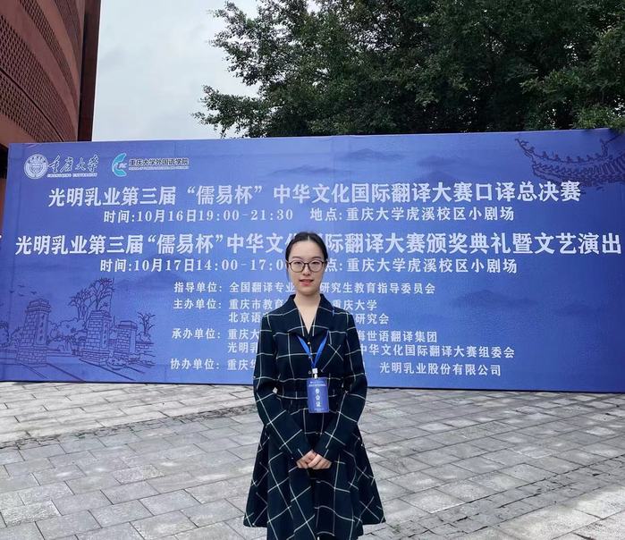 10月17日下午,第三届“儒易杯”中华文化国际翻译大赛颁奖典礼在重庆大学虎溪校区小剧场举行,中译德项目一等奖获得者、beat3652020级德语笔译研究生方路佳同学上台领奖,并发表获奖感言。她表示,能代表31名beat365vip官网登录入口beat365vip官网登录入口获奖同学上台领奖感到荣幸和自豪。她决心学好中华优秀传统文化,做好国学外译,为共建人类命运共同体贡献才华。