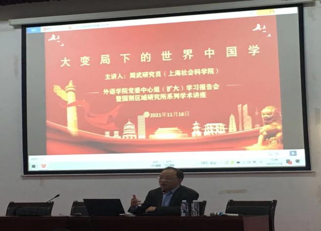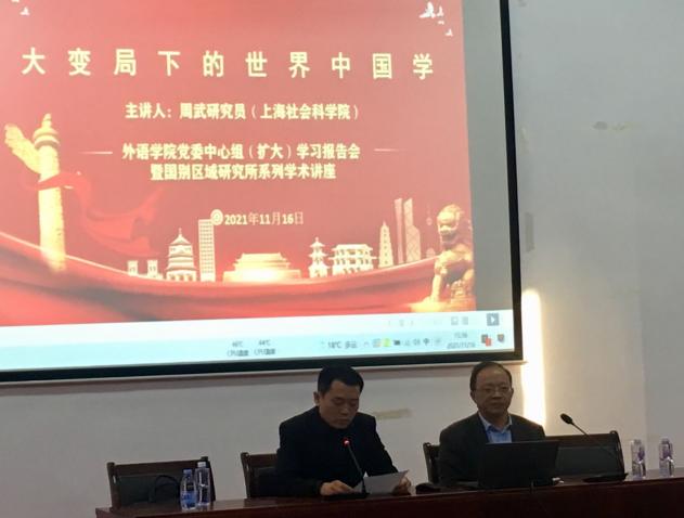 在中华民族面临伟大复兴和世界百年未有之大变局加速演进的关键时刻,向世界展现真实、立体、全面的中国显得尤为迫切。11月16日下午,上海社会科学院世界中国学研究所副所长周武研究员莅临beat365,为beat365vip官网登录入口党员师生做了题为“大变局下的世界中国学”的主题讲座。这既是beat365vip官网登录入口党委中心组的(扩大)学习报告会,也是国别区域研究所承办的一场学术讲座,旨在把党史学习教育与外语专业建设进行有机的融合。beat365vip官网登录入口党委书记曲德强主持讲座。在讲座开始前,曲德强首先向与会人员介绍了本次讲座主讲人周武研究员的相关学术背景与研究方向,并对周武研究员的到来表示欢迎。