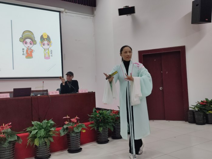 活动前半部分,张頲、卫立向大家详细介绍了昆曲的唱腔、经典剧目、昆曲行当等相关知识以及上海昆曲团五代昆剧人薪火传承的故事,让同学们对昆曲这一世界级的非物质文化遗产有了初步了解,感受昆曲魅力。张頲表演了《游园·皂罗袍》中的经典片段,并和卫立为大家带来了《惊梦·山桃红》中的精彩片段。