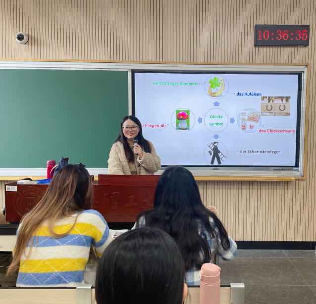 孟小果老师在此次公开课上讲授了主题为“Glück”(幸福)的一课。首先,孟老师以一首小清新的德语歌《Glück》作为课堂导入,营造出一种幸福欢乐的课堂氛围并引出课堂主题。接着,以提问的形式让学生们分组讨论什么是幸福,经过激烈的讨论,学生们呈现出多种多样的答案:爱与被爱、友谊、健康、安全感,在困难的日子里依然拥有积极乐观的心态,能够自我认可和自我定位,不过度在意别人的视线和评价等。孟老师在对学生们的答案进行肯定和扩充后,又通过一些和“幸福”相关的谚语引导学生们树立一种正确的幸福观,例如幸福掌握在自己手中,不要把自己的幸福寄托在他人身上;知足才能长乐;正确看待金钱和幸福的关系;忘却和接受不能改变的事情才能幸福。然后孟老师以图文并茂的形式展示了德国的幸运象征物及其来历:四叶草、马蹄铁、毒蝇伞、猪、一芬尼硬币、扫烟囱的工人,同时启发学生思考中国的幸运象征物又有哪些,比如中国结、“福”字、喜鹊、龙的来历,通过中德对比和充分讨论增加了学生的感悟,有利于实现专业知识与立德树人授课目标的融通。