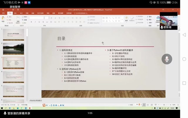 接着,管教授由浅入深地向观众讲解了Python与语料库翻译学相结合的研究方向,包含了多变量协同效应、译文可读性、翻译对等的短语特征、翻译知识库的构建与应用、语言结构识别与译后编辑、翻译质量评估、文本情感对比分析及双语工具开发与应用,并鼓励大家积极学习Python技术,努力实现从“拿来主义”到自我创新,为语料库翻译学研究创造新工具。