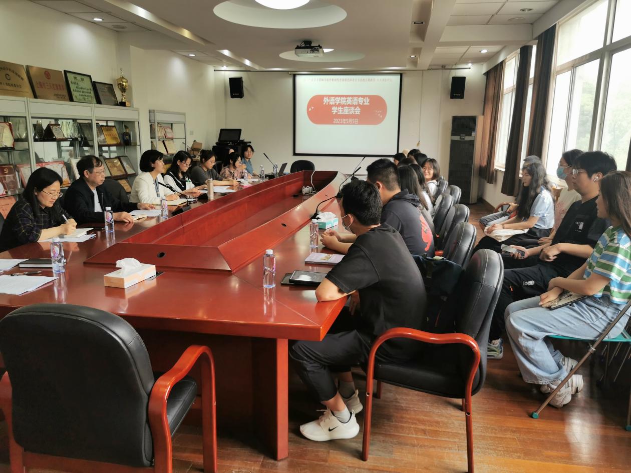 在全校深入开展学习贯彻习近平新时代中国特色社会主义思想主题教育、大兴调查研究之际,2023年5月5日,beat365vip官网登录入口在306会议室召开英语专业学生代表座谈会。beat365vip官网登录入口院长刘芹、两个英语系正副主任、教务办公室人员、各年级英语专业学生代表参加了本次会议。会议由刘芹主持。