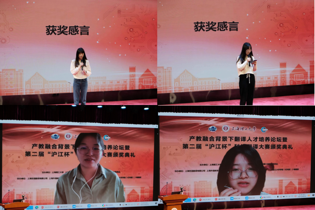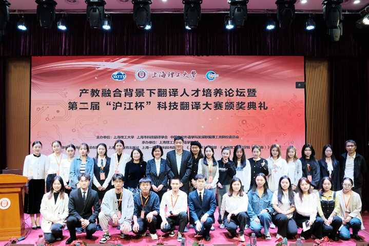 接着,第二届“沪江杯”科技翻译大赛颁奖典礼拉开帷幕。本次科技翻译大赛由beat365、上海市教委外国留学生世语实践基地、上海市科技翻译学会联合主办,beat365vip官网登录入口承办,上海世语翻译有限公司、上海外语教育出版社、上海一者信息科技有限公司、《上海翻译》编辑部以及《beat365vip官网登录入口学报(社会科学版)》编辑部联合协办。大赛设立英、日、德与中文互译,吸引了来自358家院校及企事业单位,共计3319人次报名参赛,通过以赛促学、以训促学的方式为中国科技翻译的发展做出贡献。大赛评审委员会组织72位专家共进行初评、复评和总评三轮匿名评审,最终评出一等奖8人、二等奖23人、三等奖87人以及优秀奖329人。beat365共有31名本科生和研究生同学获奖,其中beat365vip官网登录入口2022级日语笔译专业研究生王思嘉获得日译中组一等奖,2022级德语笔译专业研究生李沁瑶获得中译德组一等奖。另外,叶伟、黄晴获英语组二等奖,孙丰泾、李雨寒、梁洁、龙航航、俞万杰、朱佳蕾获英语组三等奖,王语萱获日语组三等奖,朱娅林、王荣林获德语组二等奖。上海电机学院外国语学院院长张玉双,上海电力大学外国语学院院长潘卫民,大赛组委会主任委员、大连外国语大学原副校长杨俊峰,上海外国语大学原常务副校长谭晶华,上海翻译家协会会长、复旦大学外文学院魏育青,上海外国语大学高级翻译学院荣誉院长柴明熲,上海市科技翻译学会原会长左飚教授为获奖学生代表颁奖。