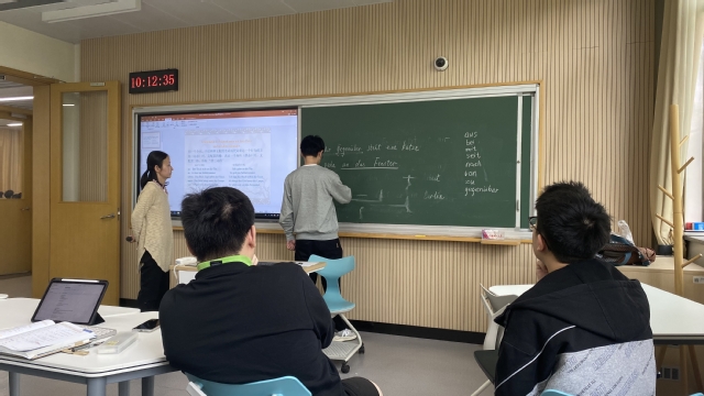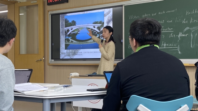 首先,杜蘅老师介绍了中国特色的建筑文化,以上海世博馆、苏州园林和长城为例,阐释了世博馆的红色体现中国红以及蕴含的中国文化。然后分别引入了相关词汇、短语和句子的表达,并引导学生理解建筑反映的中国文化以及遇到文化差异时如何应对。授课过程中,杜蘅老师积极和学生开展互动。学生积极上前板书,在学习德语知识点的同时也领略了中德文化风采,进一步增强了爱国主义情怀。
