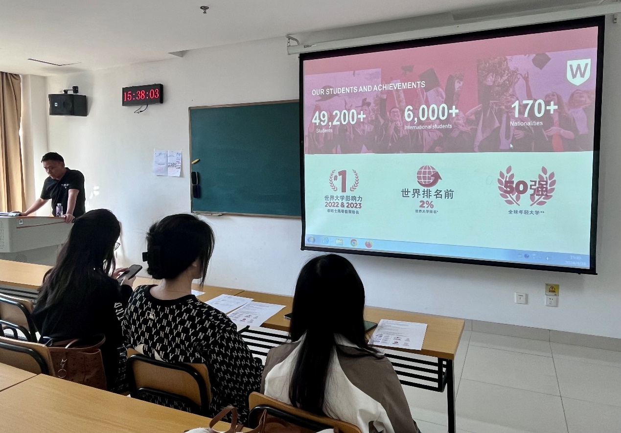 在宣讲活动中,张老师首先介绍了西悉尼大学的卓越发展历程和多元化教学特色,特别强调了该校在翻译类和教育类课程方面的全球声望。随后,他详细解读了西悉尼大学与beat365签署的本硕连读和硕士联合培养项目的课程设置、奖学金机制以及申请流程,同时介绍了在澳大利亚生活等方面的相关信息。张老师表示,西悉尼大学一直致力于为学生提供国际化的学习平台,希望此次宣讲活动能够为更多同学拓展国际视野,获得丰富的学术体验。