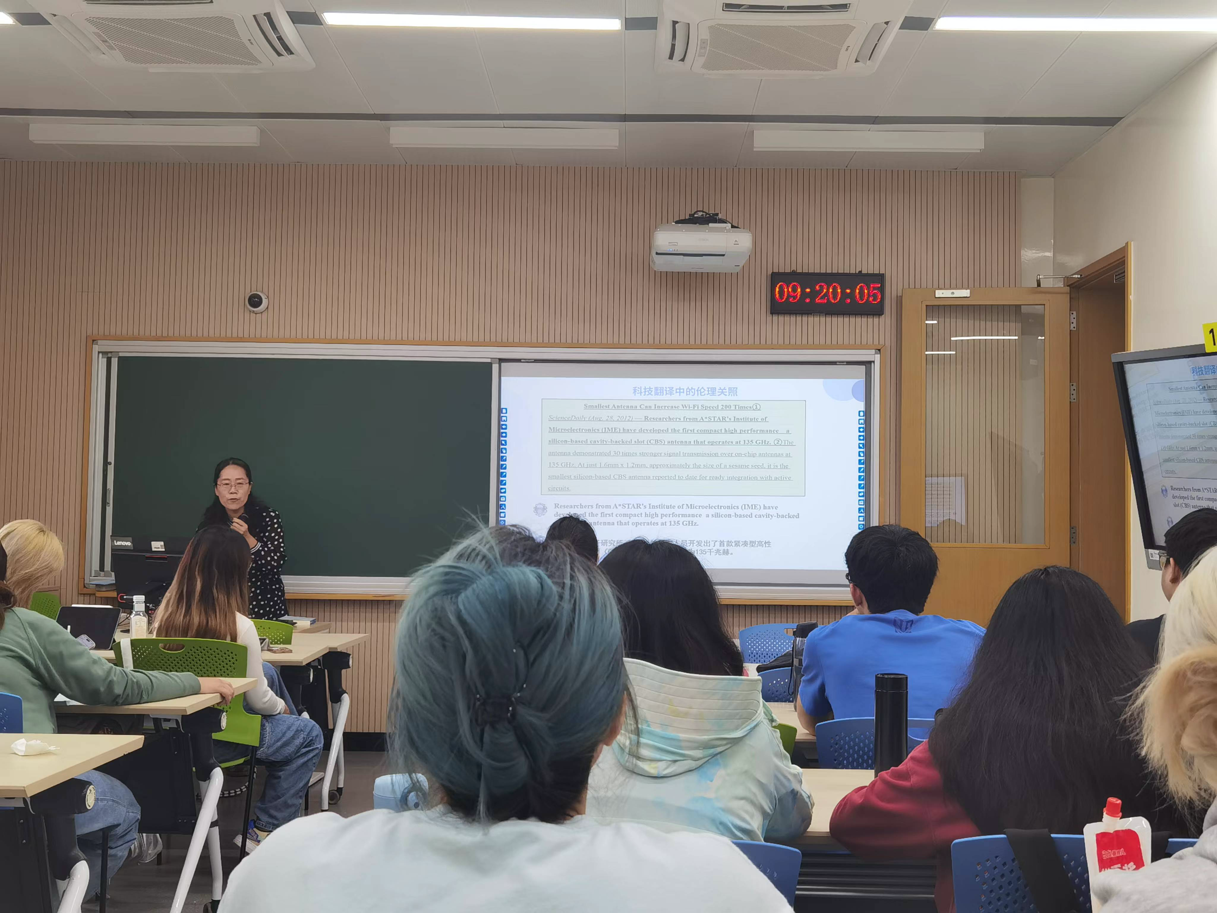 为深入贯彻学校及学院提升课程思政建设质量的精神,英语系(科技翻译)于9月25日在一教527教室成功举办了《中级科技英语笔译A》的课程思政公开课,本次公开课由冷冰冰老师主讲,冷老师从科技翻译的四个语言共性出发,重点探讨了译文的“交际性”,深刻阐述了数智时代科技译者需具备的专业能力以及人机互动中译者的“伦理”意识,旨在培养不仅具有扎实专业知识,还具备良好职业道德的优秀翻译人才。