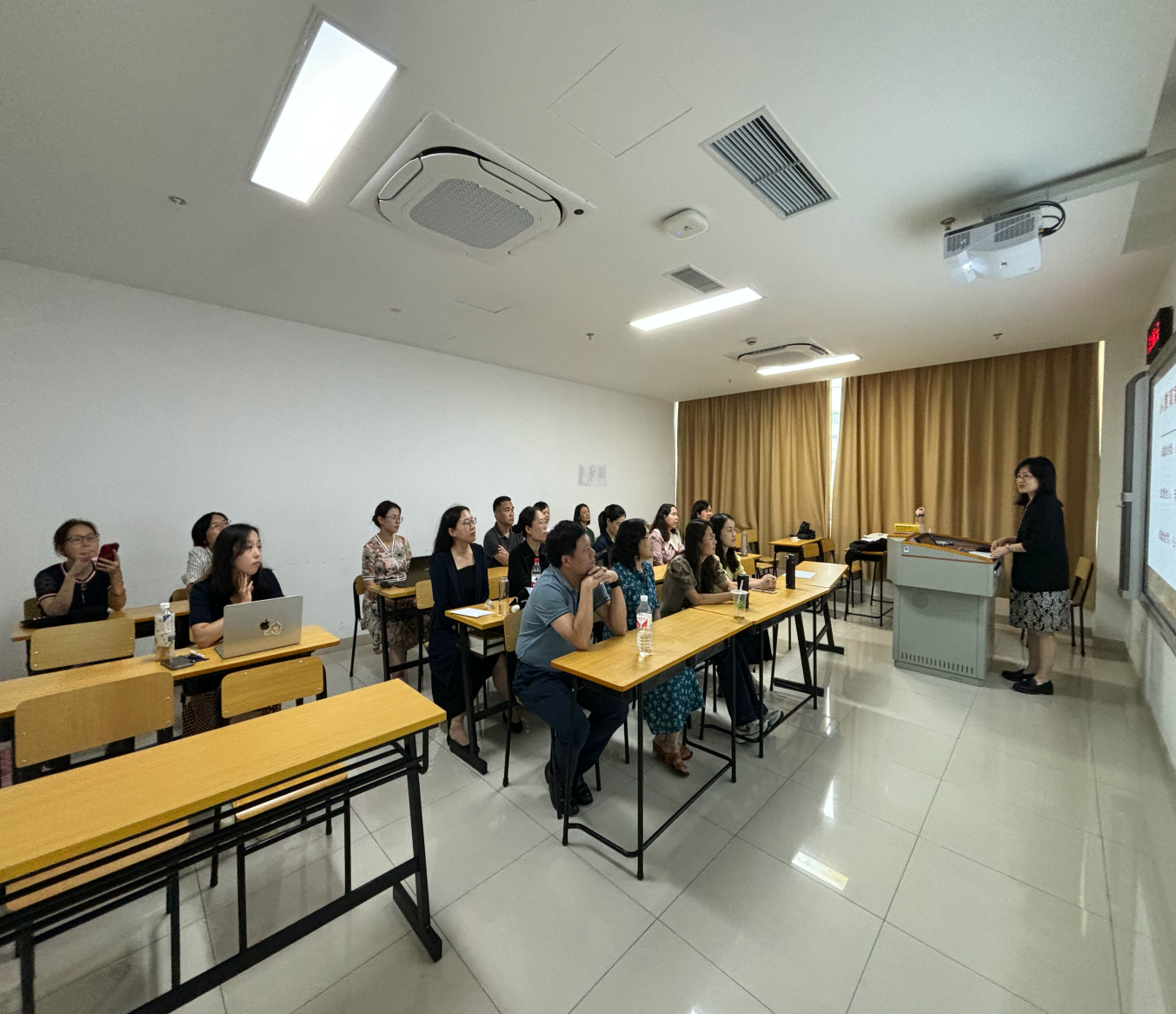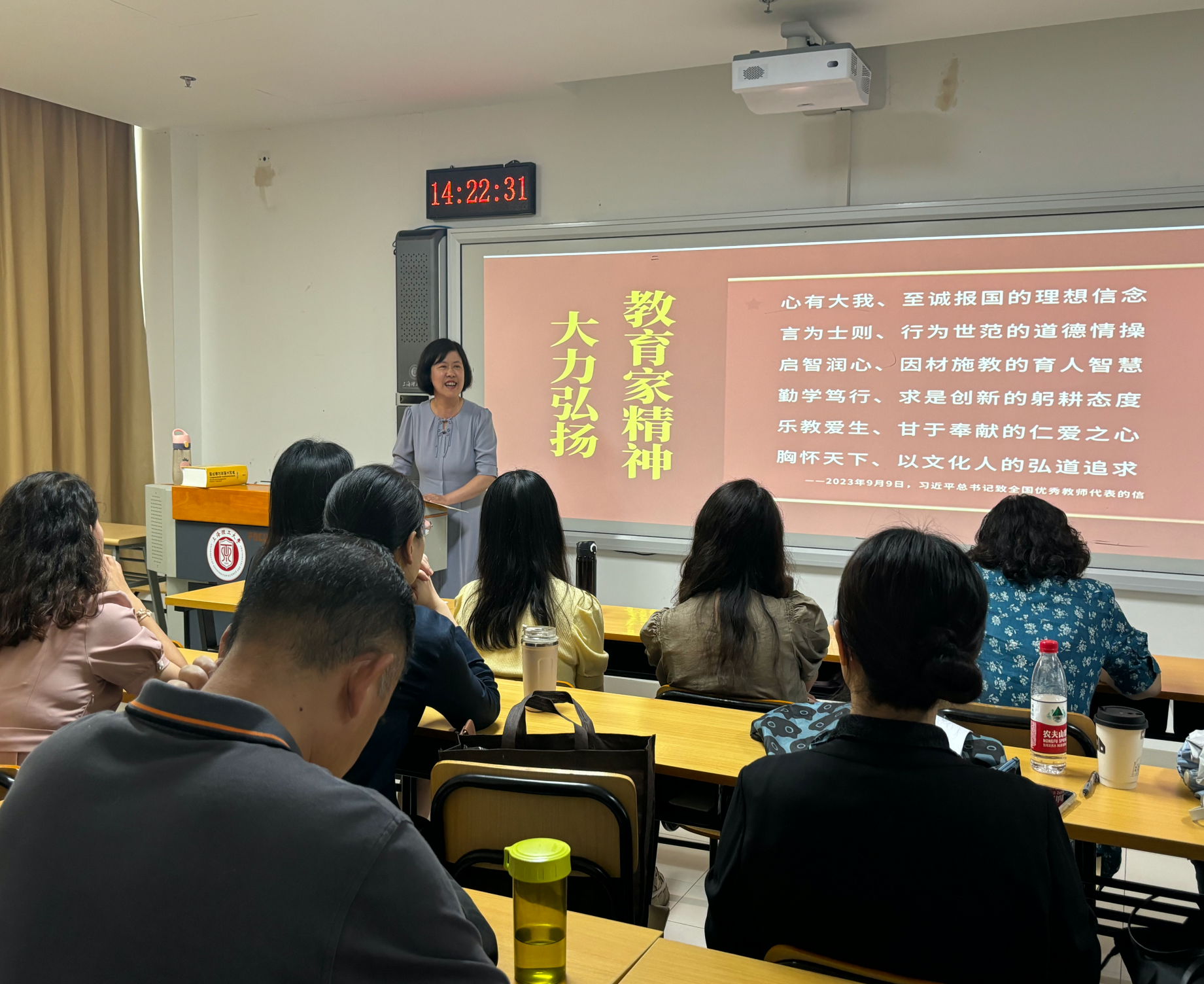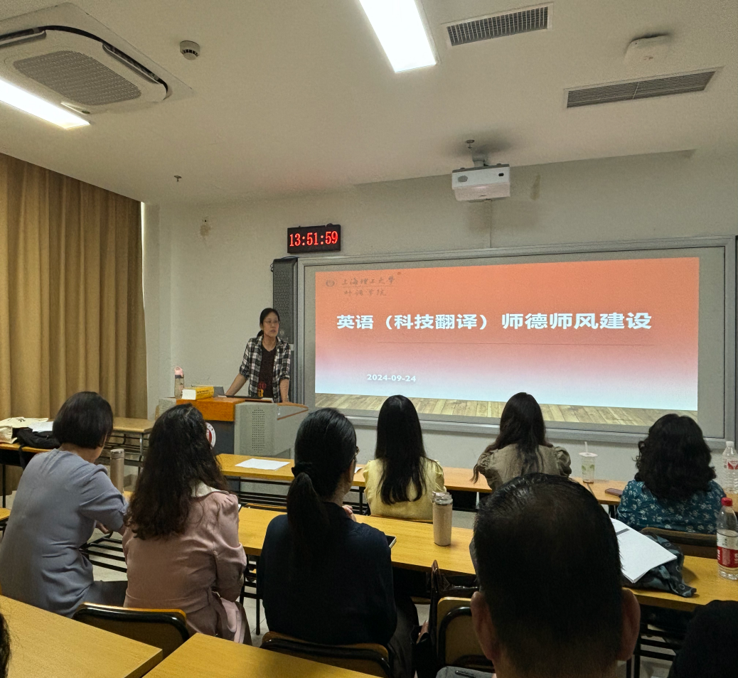 为迎接第40个教师节,贯彻落实《中国中央国务院关于弘扬教育家精神加强新时代高素质专业化教师队伍建设的意见》精神,根据学校及学院师德师风建设月活动安排,英语(科技翻译)系于9月24日下午,在国合楼210教室开展了“以大力弘扬教育家精神,加快建设教育强国”为主题的师德师风专题教研活动。