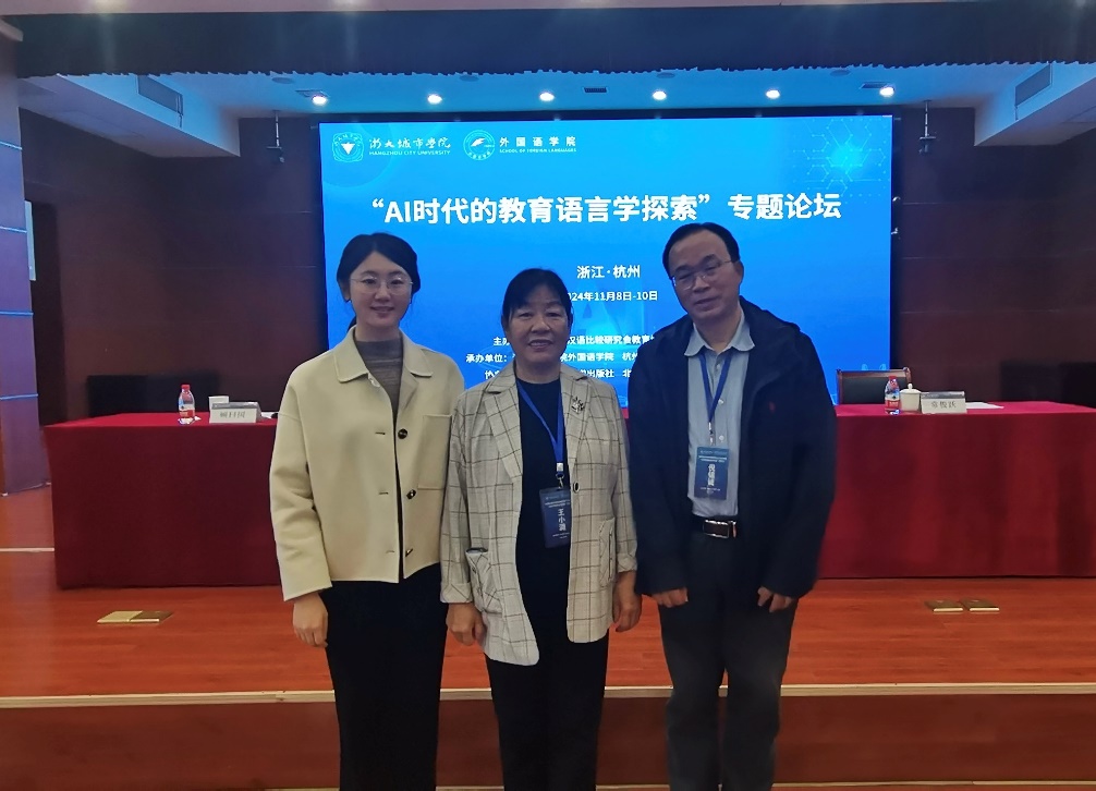 2024年11月8日至10日,中国英汉语比较研究会教育语言学专委会“AI时代的教育语言学探索”专题论坛在浙大城市学院隆重召开。本次会议由中国英汉语比较研究会教育语言学专业委员会主办,浙大城市学院外国语学院和杭州语言服务协同创新研究中心共同承办,华东师范大学出版社和北京心拓视点科技有限公司为联合承办单位,旨在深入探讨AI时代的教育语言学理论与实践问题。本次专题论坛的与会专家学者交流和展示了最新学术研究成果,并展望了未来相关领域的研究发展。会上,顾曰国、丁鼐、倪传斌、彭剑娥、张荔、何文忠、祝智庭、王华树、郑春萍、姜孟等专家学者做了主旨发言,共研、共商了AI时代教育语言学的前沿问题,展示了语言学与脑科学、认知科学、社会心理学等学科领域的交叉融合和发展。