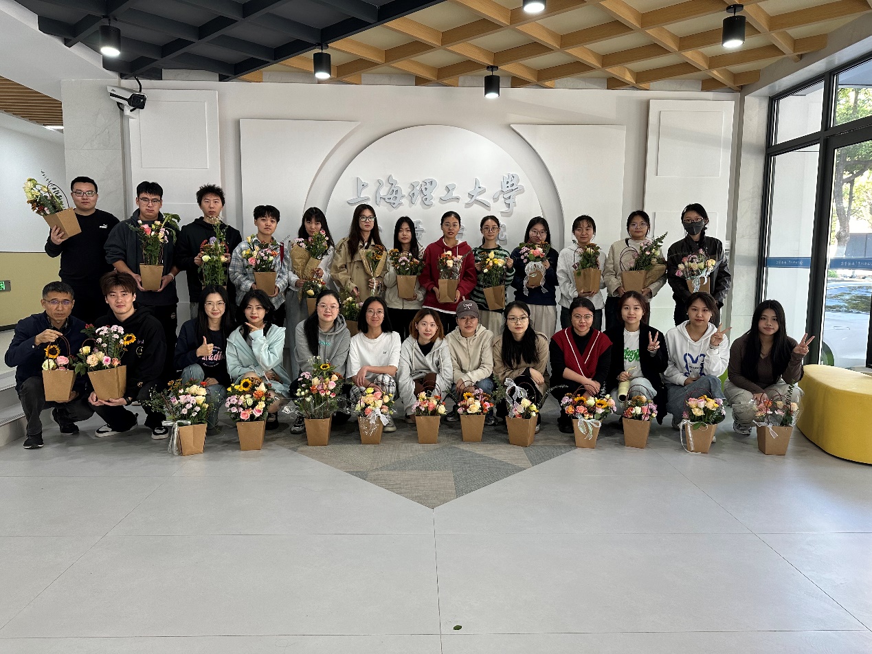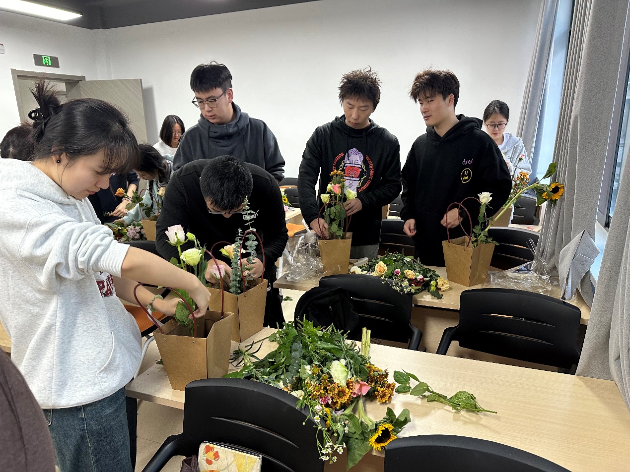 活动现场,大家围坐在beat365vip官网登录入口楼102教室,桌上摆满了五颜六色的鲜花、绿叶和装饰花材。同学们一边挑选花材一边交流插花的创意和心得,有的同学细心地将各种花枝进行色彩和高度的搭配,有的则大胆尝试不同风格的组合,大家沉浸其中,尽情创作,氛围格外热烈而温馨。在活动中,同学们不时互相点评,分享如何选择主花、副花、配叶等技巧,为作品增添更多层次感和个性化的装饰。