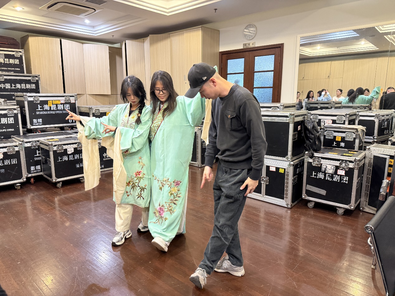 接着,同学们迎来了此次参观的第二个环节——参观昆曲演员们排练。讲解员介绍道这场排练是与故宫合作表演的一场新戏,引起不少同学好奇。排练厅里,演员们一招一式、一颦一笑都尽显功力。他们在举手投足间将昆曲的韵味展现得淋漓尽致,水袖轻舞如行云流水,唱腔婉转似黄莺出谷。学生们在剧场里静静观看,被这专注投入的排练氛围深深感染。这种近距离的观摩,让学生们感受到了昆曲艺术的严谨与魅力,也对这些坚守传统艺术的演员们肃然起敬。