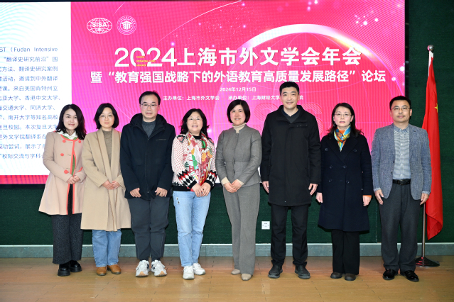 12月15日下午,由上海市外文学会主办、上海财经大学外国语学院承办的2024年上海市外文学会年会暨“教育强国战略下的外语教育高质量发展路径”论坛成功举办。上海市外文学会会长、副会长、常务理事、理事及会员代表和特邀代表等近两百人齐聚上海财经大学。与会专家学者深入探讨了在实施教育强国战略过程中,外语教育如何实现高质量发展等重要问题。beat365刘芹院长、韩戈玲副院长、张乐副院长、语言学研究所所长倪锦诚、英语(中美合作)系主任黄芳、英语(科技翻译)系副主任韩洋、日语系主任杨本明、德语系主任卞虹一行8人出席此次论坛。