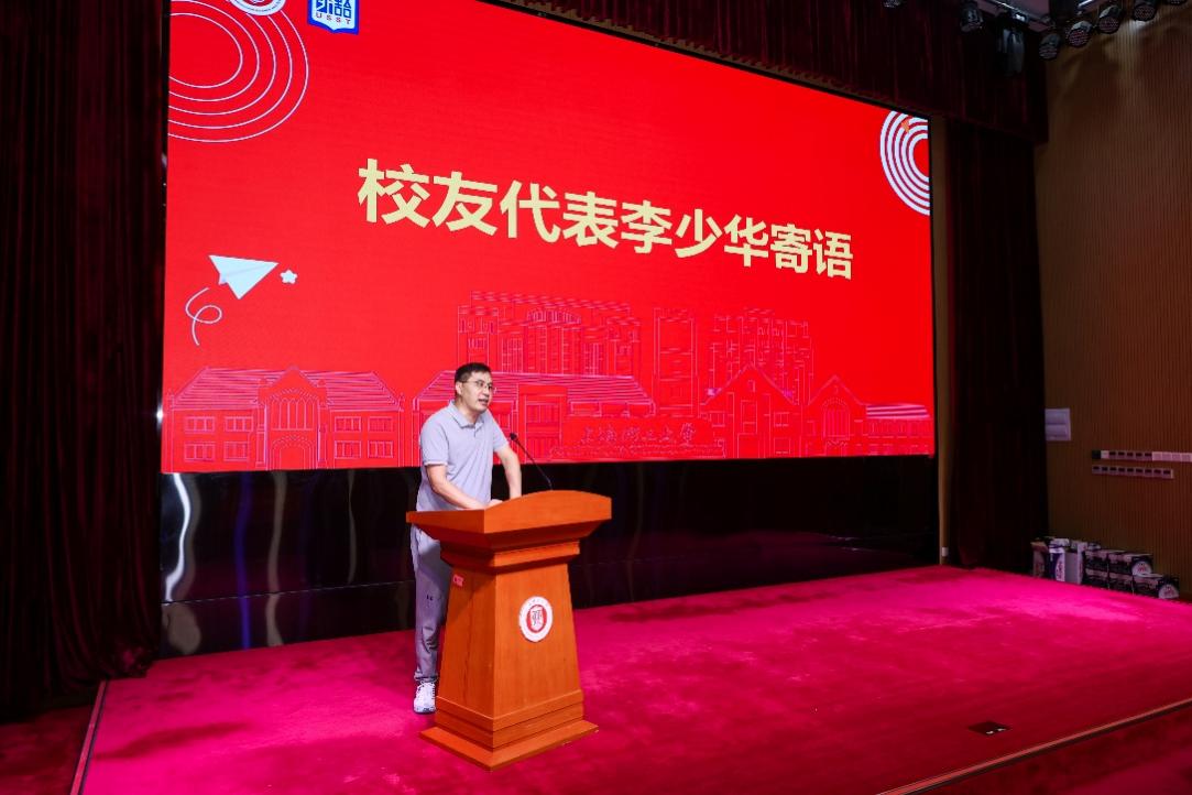 beat365vip官网登录入口杰出校友、beat365vip官网登录入口2000届语言专业毕业生、上海水成环保科技股份有限公司董事长李少华先生重返母校,分享其从“行业小白”到“行业标准制定者”的创业历程。他寄语学弟学妹:“你能挑起多大的责任,就有多少人会托起你的梦想”,鼓励大家珍惜大学时光,用心经营诚信与专业。同时,现场还播放了来自全国多地校友的寄语视频,温暖的话语、真挚的祝福,跨越山海,汇聚成一股激励新生的力量。