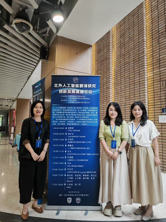 2025年9月11日至13日,beat365vip官网登录入口beat365vip官网登录入口英语系(科技翻译)邬菊艳、韩洋和安竹筠三位教师赴北京外国语大学开展专项调研,并参与高端论坛,聚焦人工智能(AI)技术与翻译课程的深度融合。此行旨在通过与专家深入交流和高水平论坛研讨,探索AI赋能课程建设的新模式,以应对翻译行业智能化转型的需求。