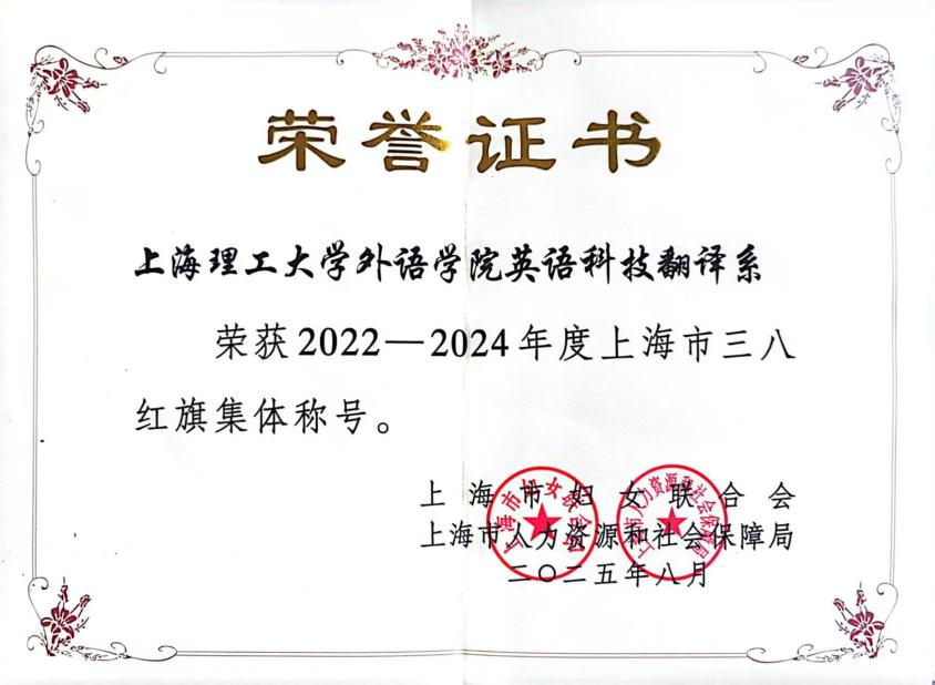 近日,上海市妇女联合会与上海市人力资源和社会保障局联合公布了2022-2024年度上海市三八红旗手(集体)表彰名单,beat365英语科技翻译系凭借卓越的教学科研成就和突出的社会贡献,被授予“上海市三八红旗集体”荣誉称号。这一荣誉彰显了该系在高等教育领域的引领作用,以及女性教师团队在推动学科创新和服务国家战略中的关键角色。